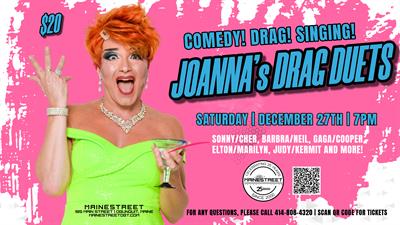 Celebrating 15 seasons in Ogunquit, Joanna from DULEING DRAG DIVAS delivers a one night only live singing comedy drag solo show! JOANNA'S DRAG DUETS features hysterical parodies of Sonny and Cher, Barbra and Neil, Gaga and Cooper, Kermit and Judy plus lots more!